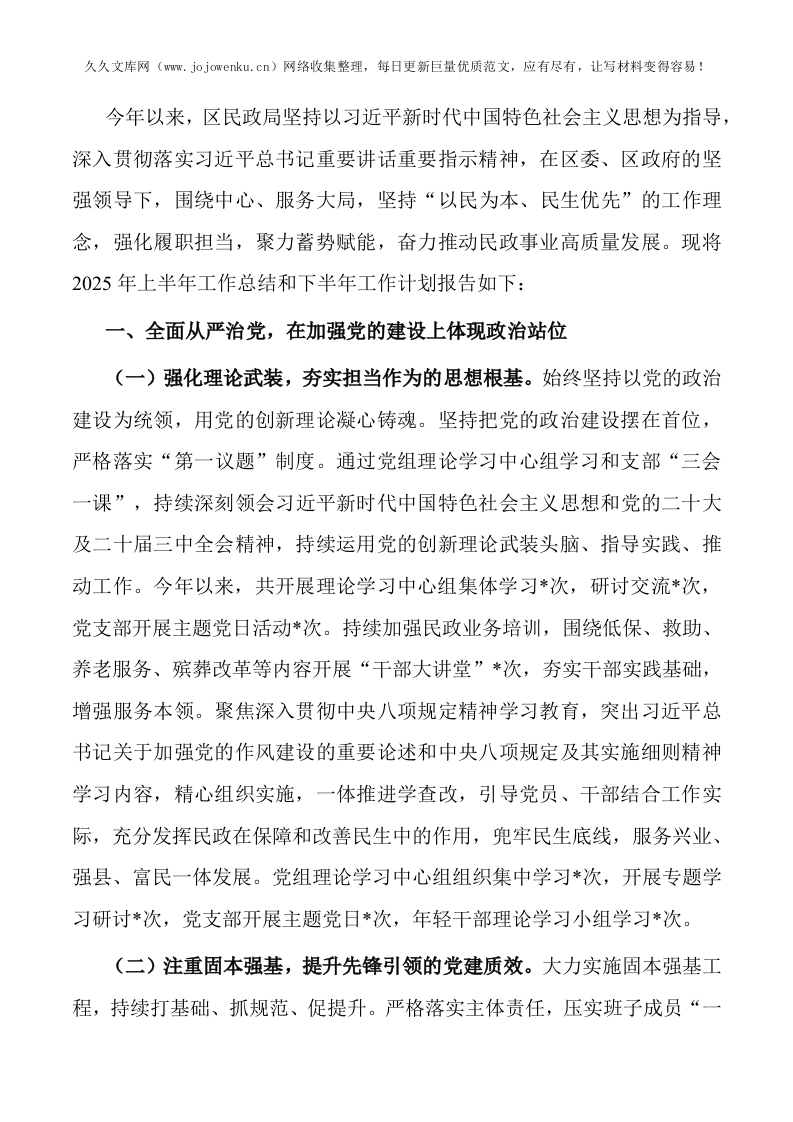 区民政局2025年上半年工作总结及下半年工作计划