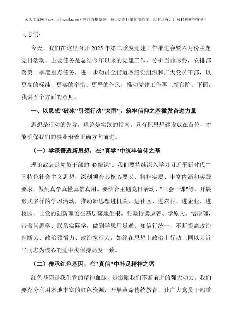 街道党工委书记在2025年第二季度党建工作推进会暨六月份主题党日活动上的讲话
