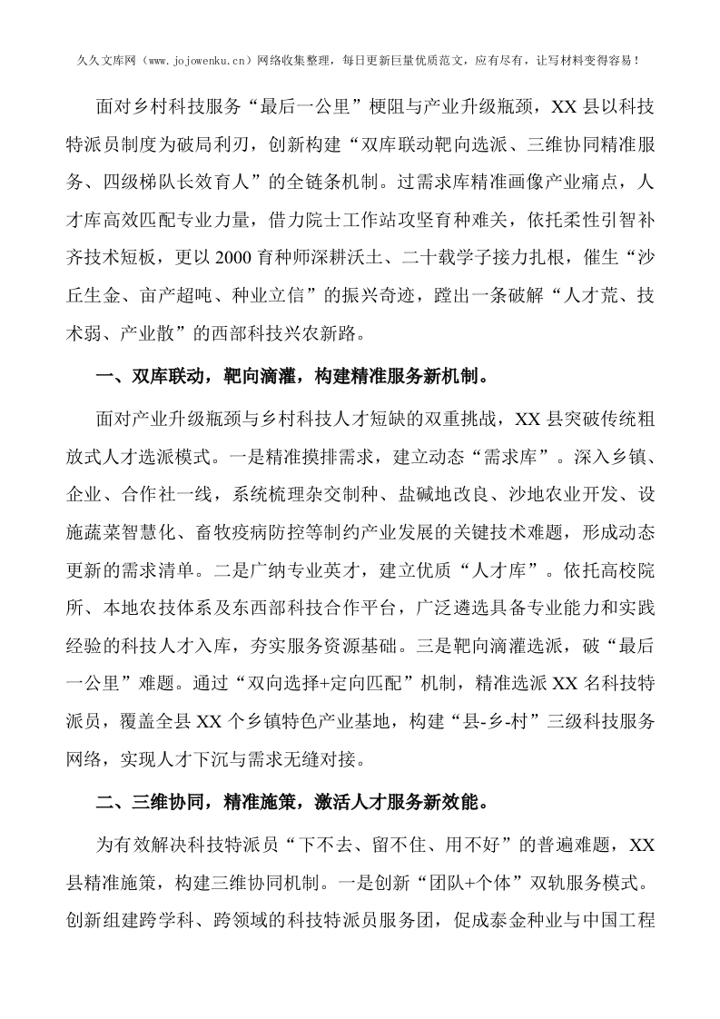 经验材料:县推行科技特派员制度 蹚出科技兴农新路