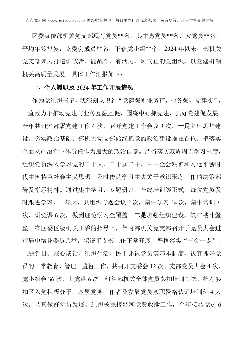 首页公文大全述职述廉区委宣传部机关党支部书记2024年述职报告