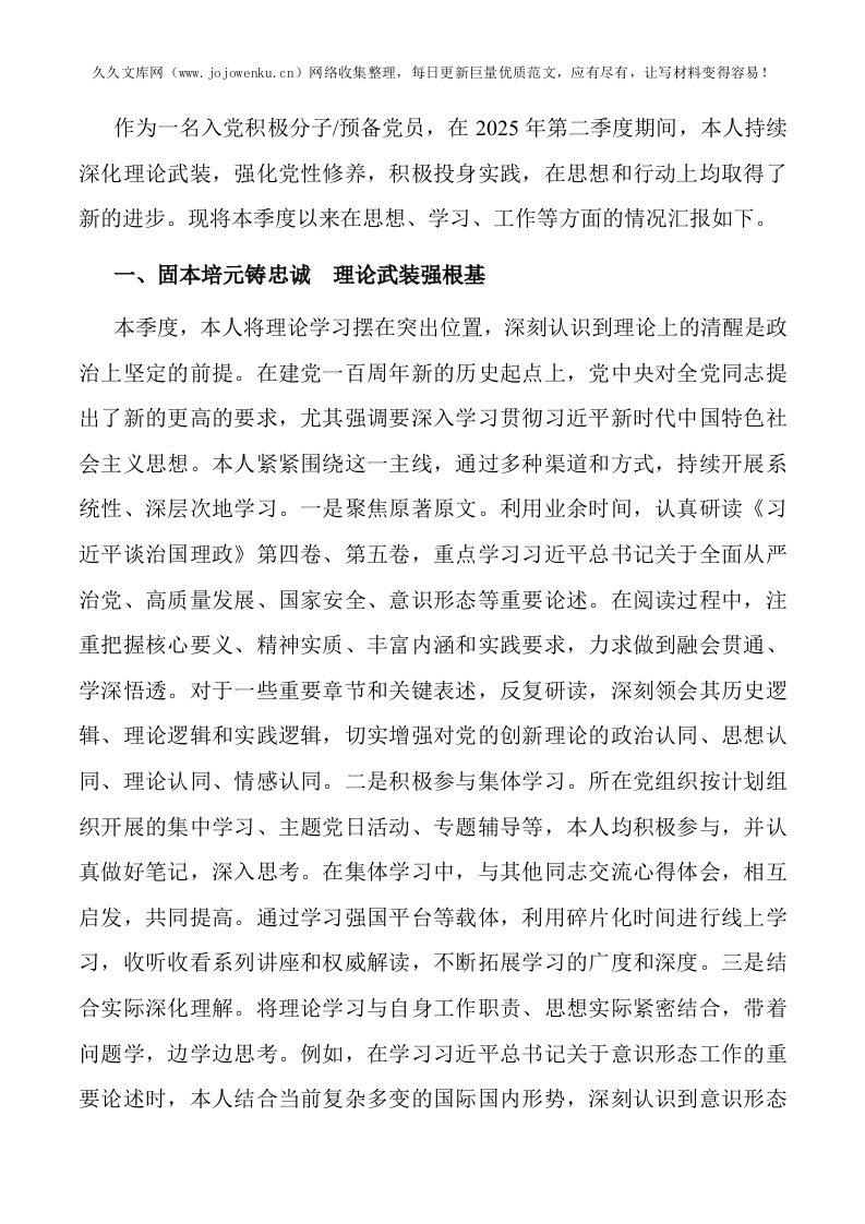 首页公文大全申请入党等党务材料思想汇报入党积极分子(预备党员)2025年第二季度思想汇报