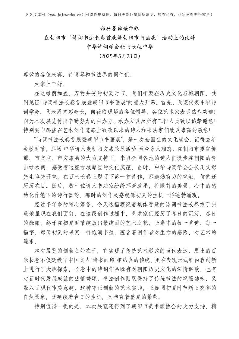 中华诗词学会秘书长杭中华:在朝阳市“诗词书法长卷首展暨朝阳市书画展”活动上的致辞:诗行墨韵焕华彩