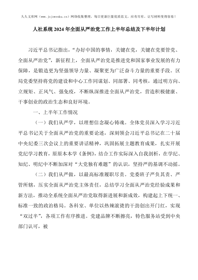 人社系统2024年全面从严治党工作上半年总结及下半年计划