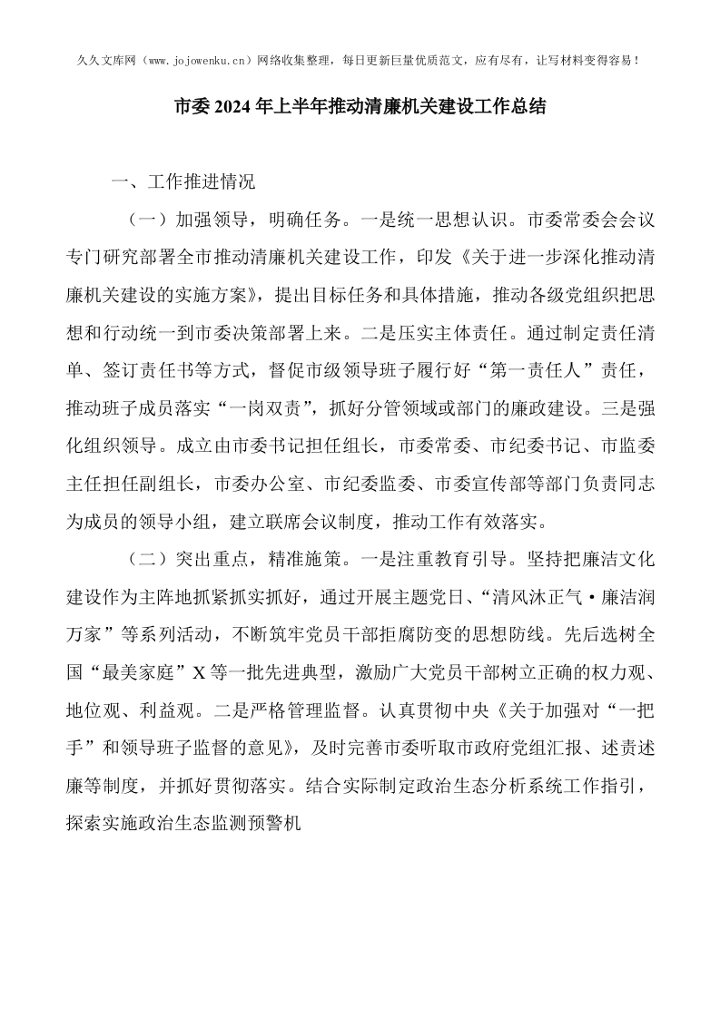 首页公文大全总结报告总结市委2024年上半年推动清廉机关建设工作总结
