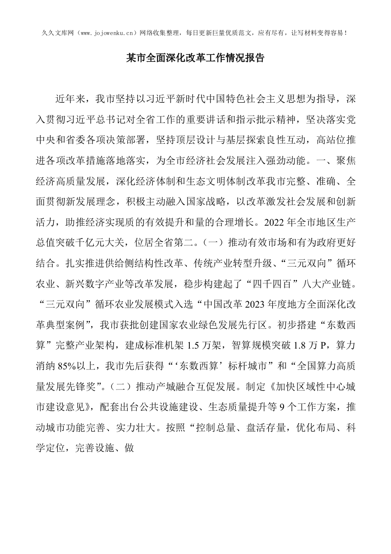 首页公文大全总结报告报告某市全面深化改革工作情况报告