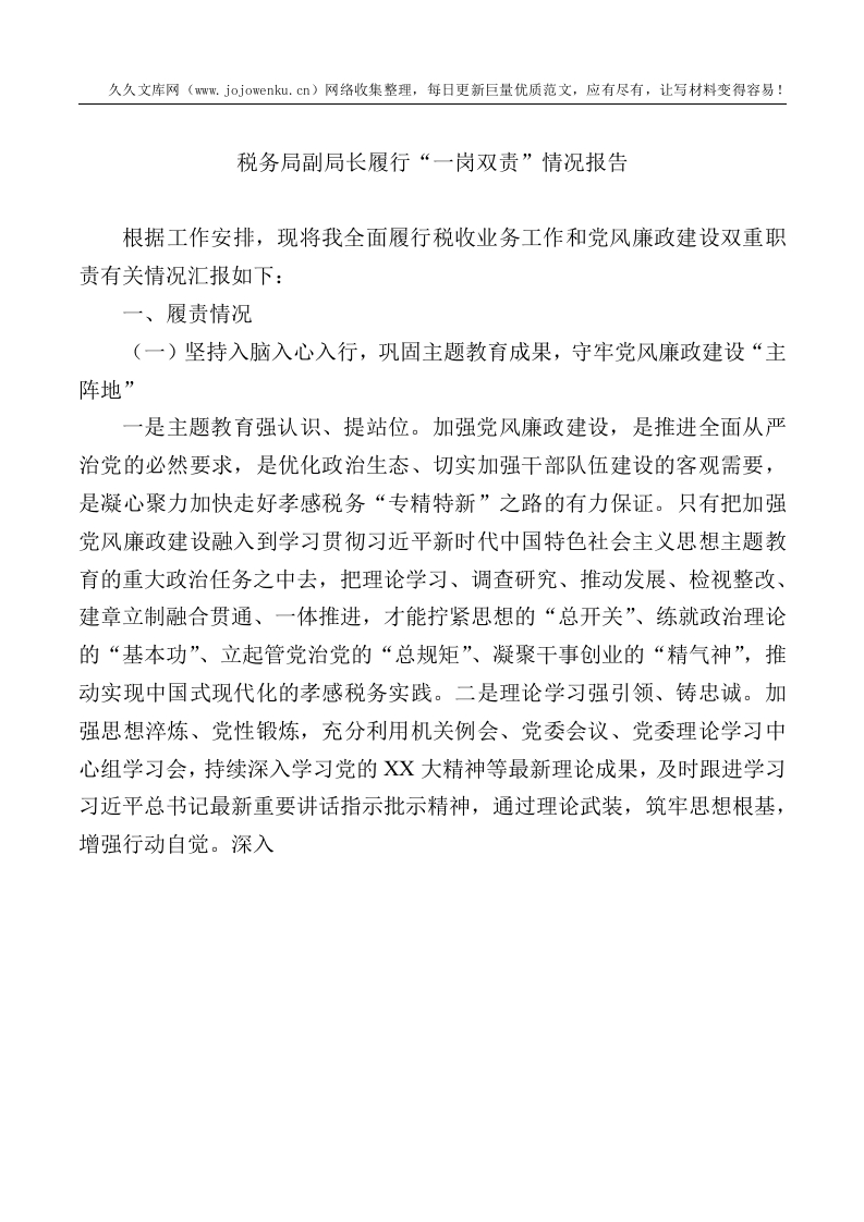 首页公文大全总结报告报告税务局副局长履行“一岗双责”情况报告