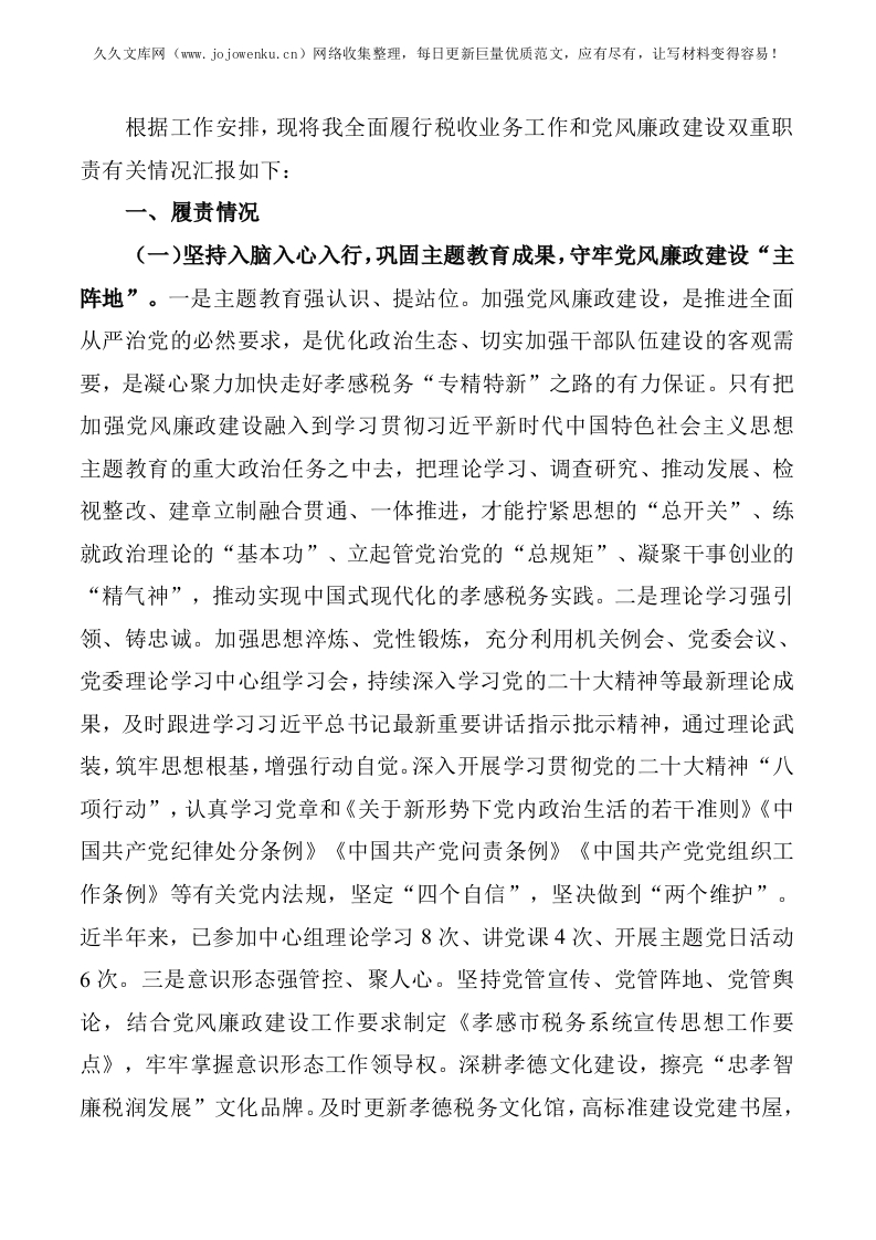 税务局副局长履行党风廉政建设和反腐败工作责任制“一岗双责”情况报告
