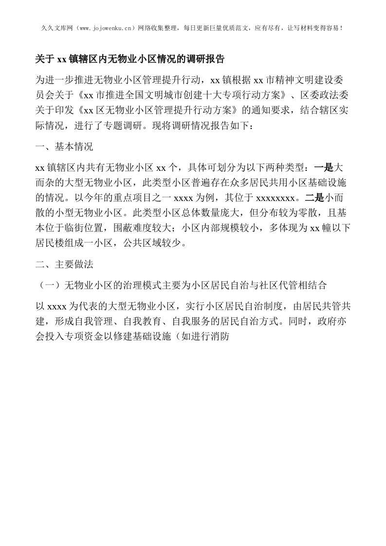 首页调查研究调研报告关于xx镇辖区内无物业小区情况的调研报告