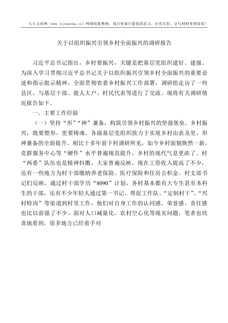 关于以组织振兴引领乡村全面振兴的调研报告