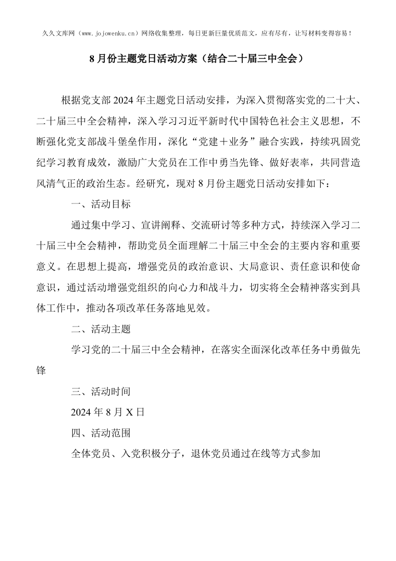 首页公文大全计划方案、要点8月份主题党日活动方案(结合二十届三中全会)