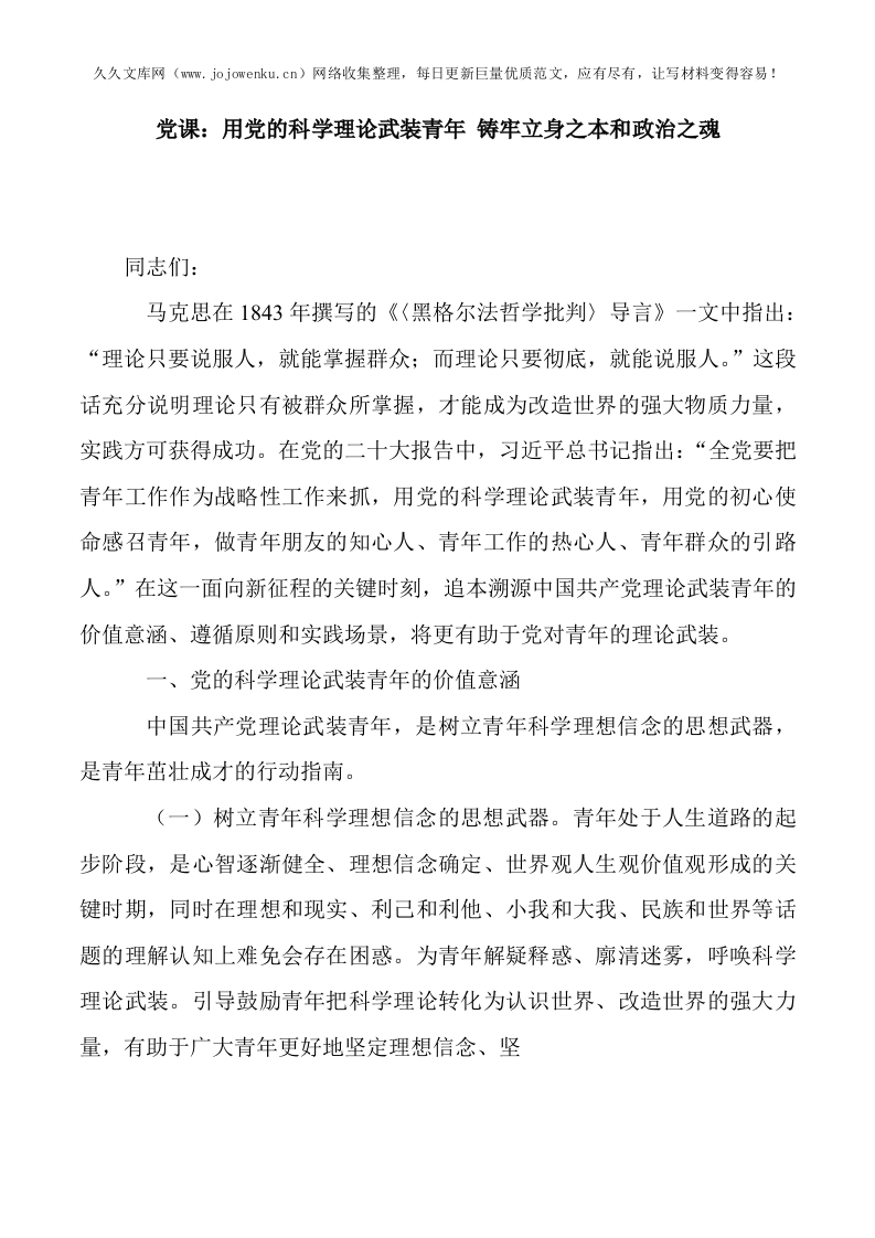 首页公文大全党课讲稿 党课:用党的科学理论武装青年 铸牢立身之本和政治之魂