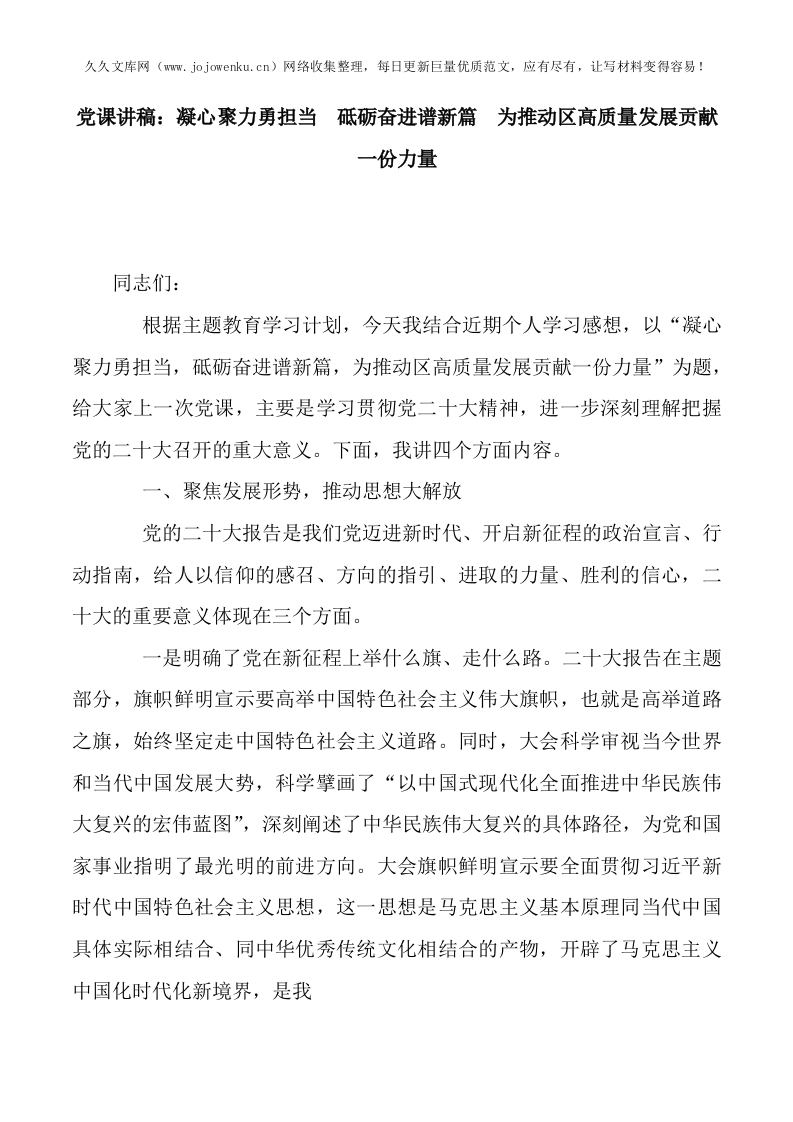 党课讲稿:凝心聚力勇担当 砥砺奋进谱新篇 为推动区高质量发展贡献一份力量