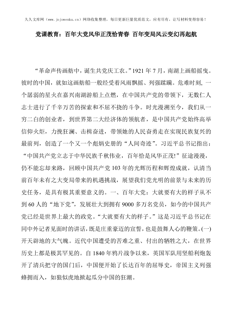 首页公文大全党课讲稿 党课教育:百年大党风华正茂恰青春 百年变局风云变幻再起航