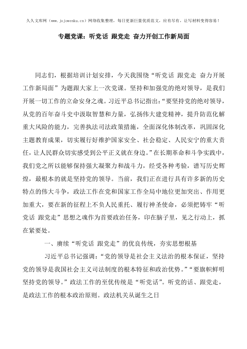 首页公文大全党课讲稿 专题党课:听党话 跟党走 奋力开创工作新局面