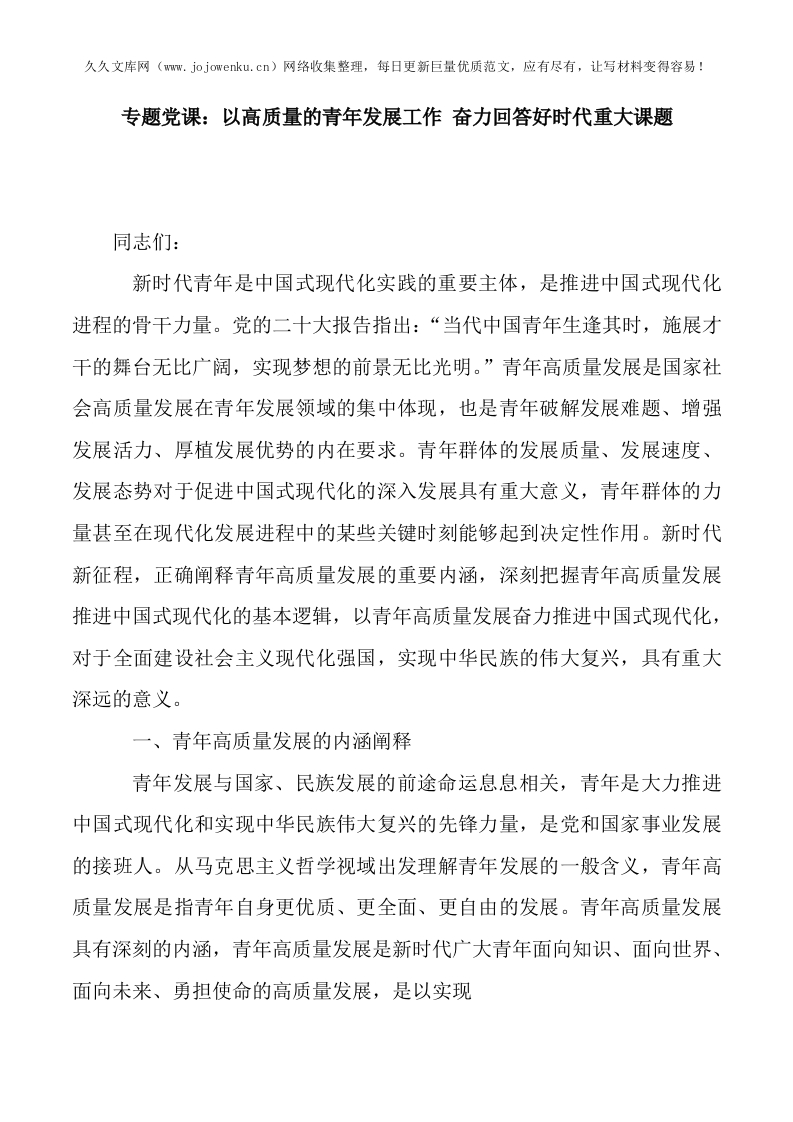 专题党课:以高质量的青年发展工作 奋力回答好时代重大课题