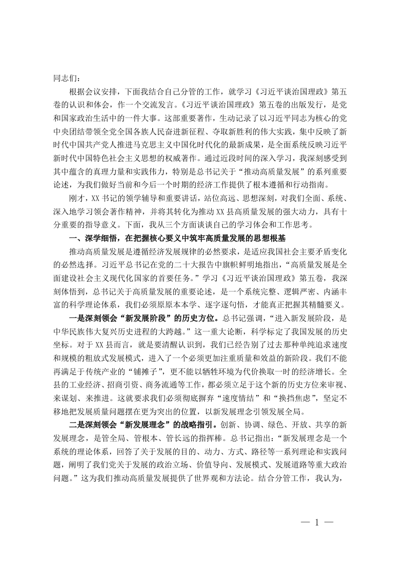 县长在县委理论学习中心组《习近平谈治国理政》第五卷集中学习研讨会上的发言材料