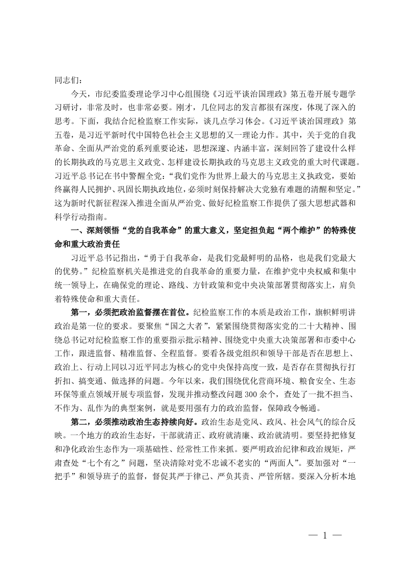 在市纪委监委理论学习中心组学习《习近平谈治国理政》第五卷专题研讨会上的发言
