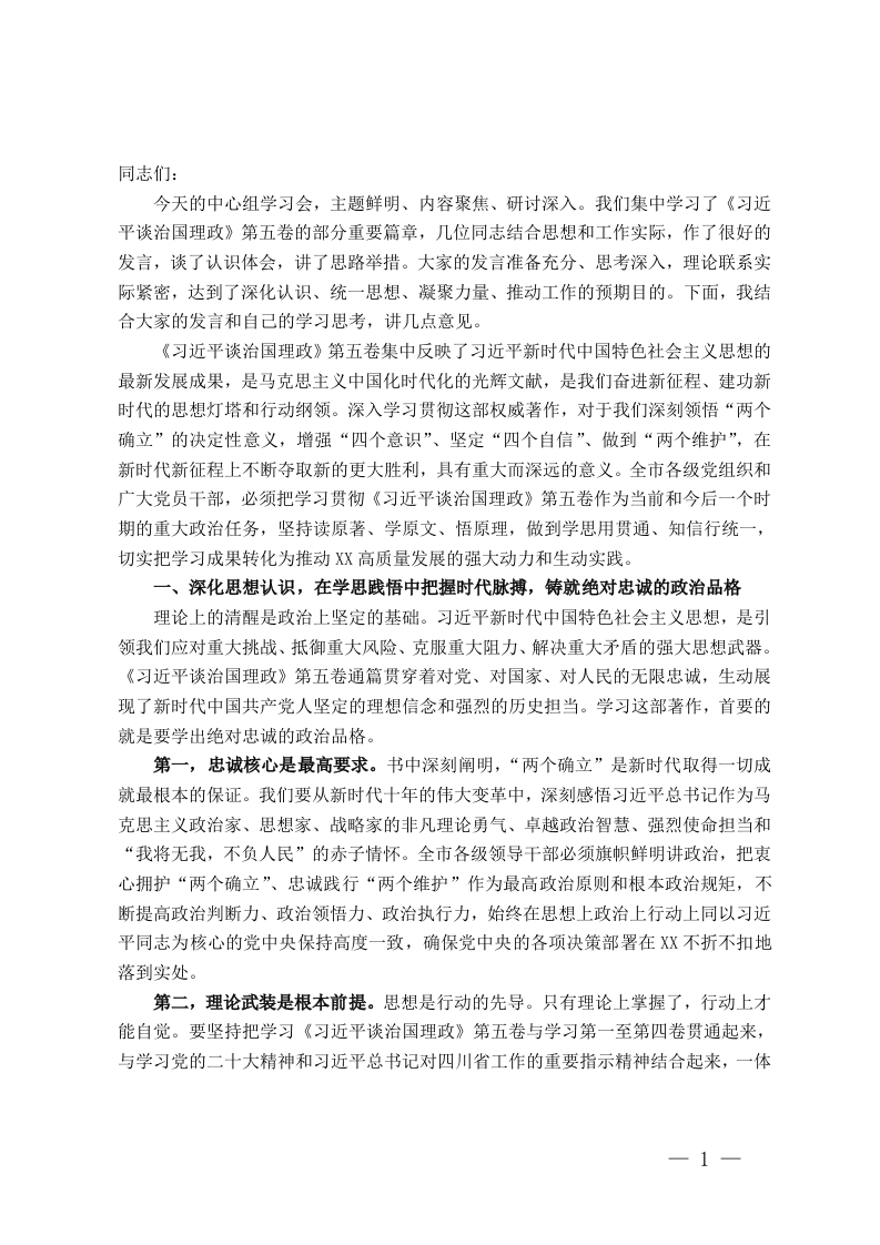 在市委理论学习中心组学习会上学习《习近平谈治国理政》第五卷的总结讲话