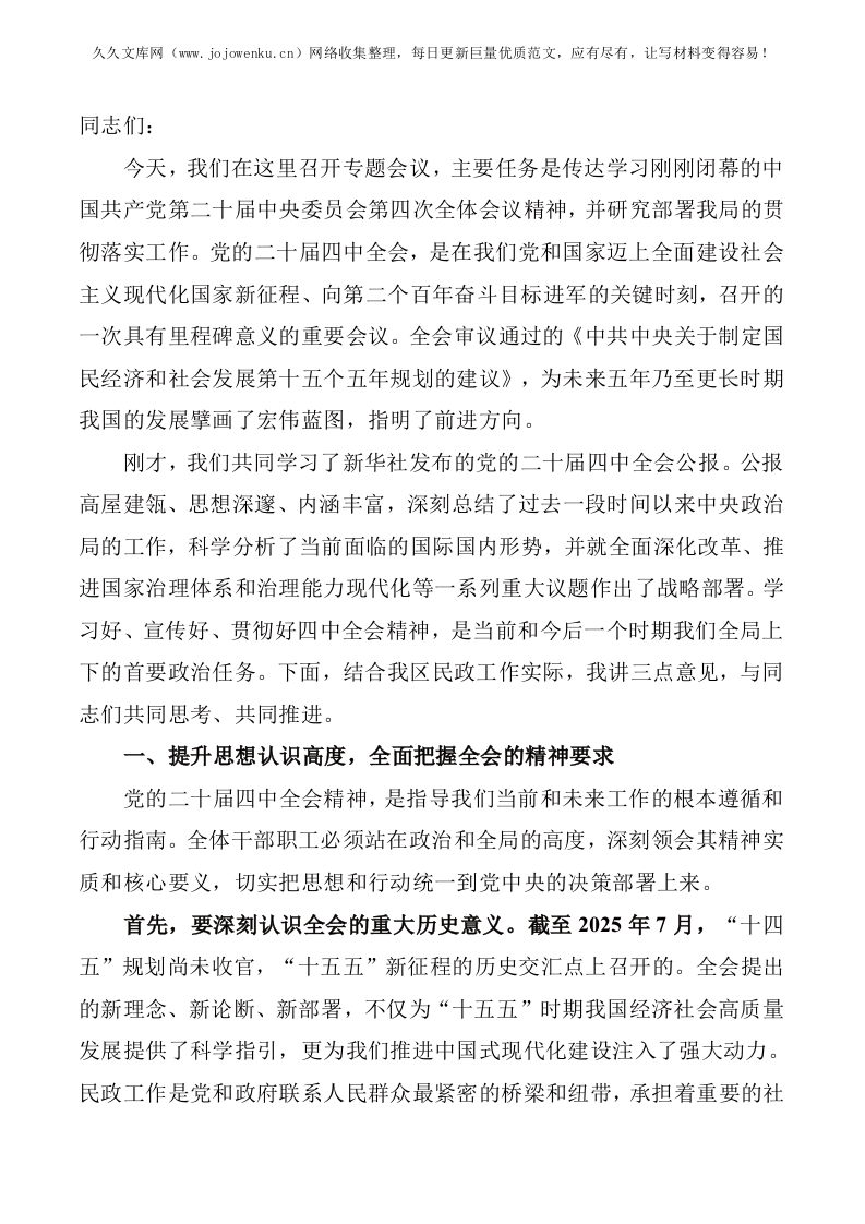在区民政局传达学习党的二十届四中全会精神专题会议上的总结讲话
