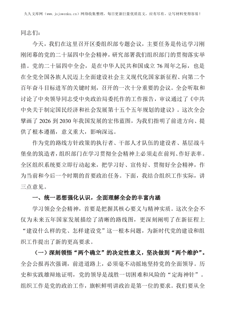 在区委组织部传达学习党的二十届四中全会精神专题会议上的讲话