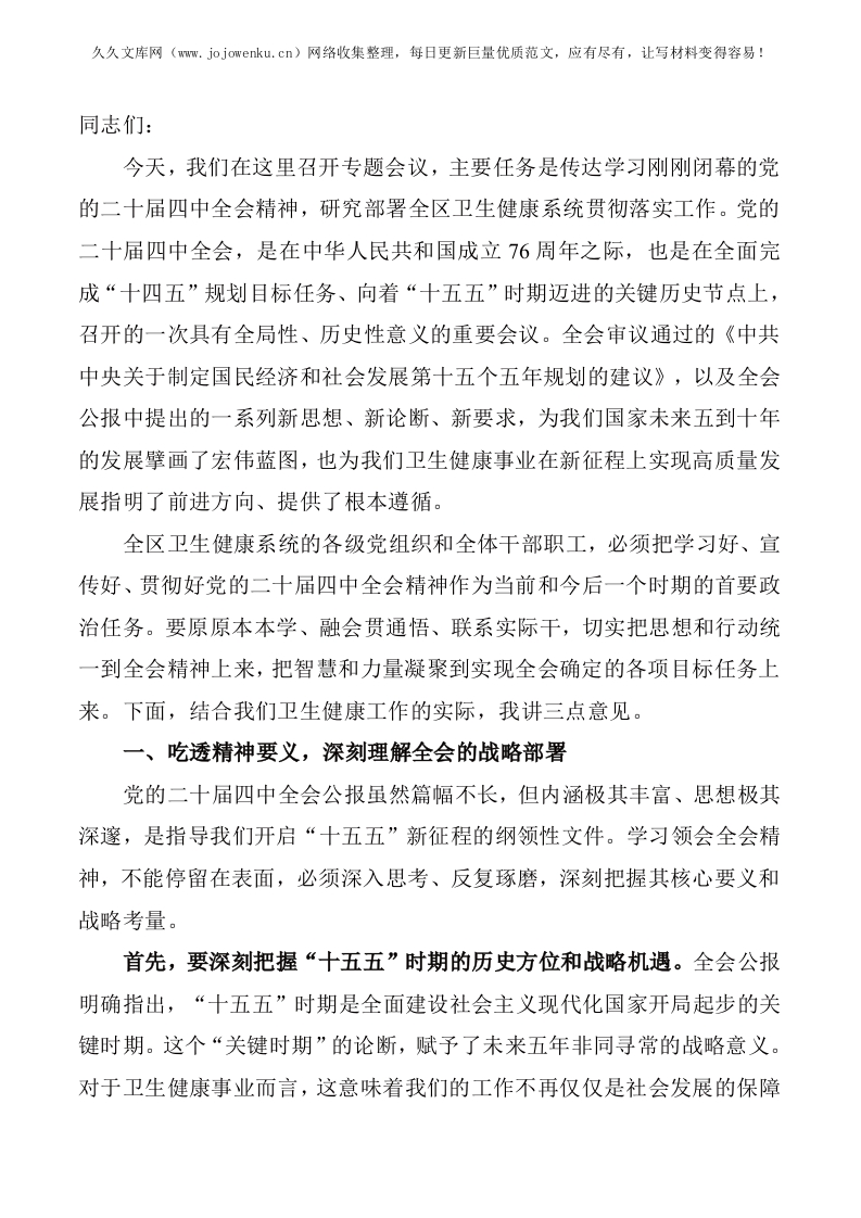 在区卫生健康局传达学习党的二十届四中全会精神专题会议上的讲话
