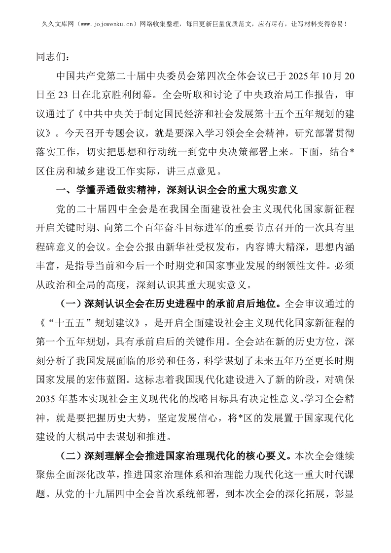 在区住房和城乡建设局传达学习党的二十届四中全会精神专题会议上的总结讲话