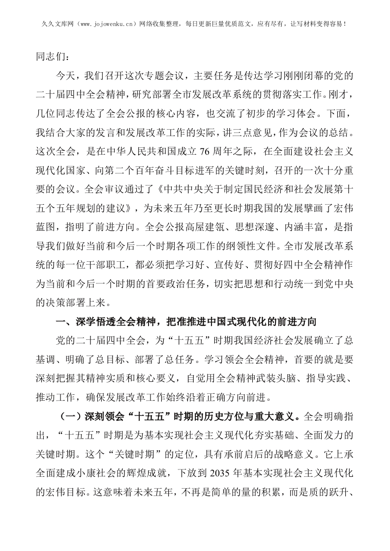 在全市发展和改革系统传达学习党的二十届四中全会精神专题会议上的总结讲话