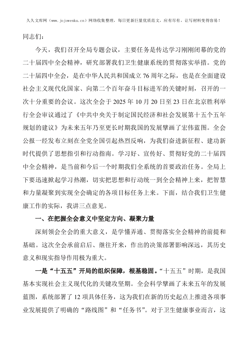 在卫生健康局传达学习党的二十届四中全会精神专题会议上的讲话