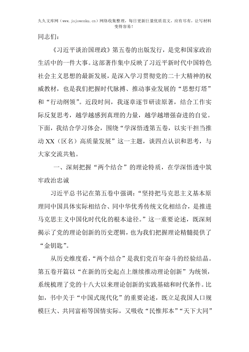 在区委理论学习中心组学习《习近平谈治国理政》第五卷专题研讨会上的发言