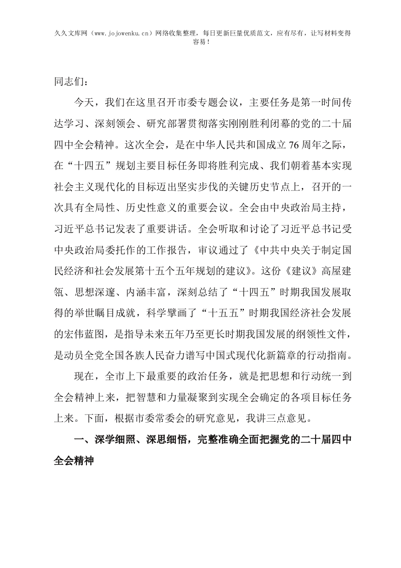 在市委传达学习党的二十届四中全会精神专题会议上的讲话