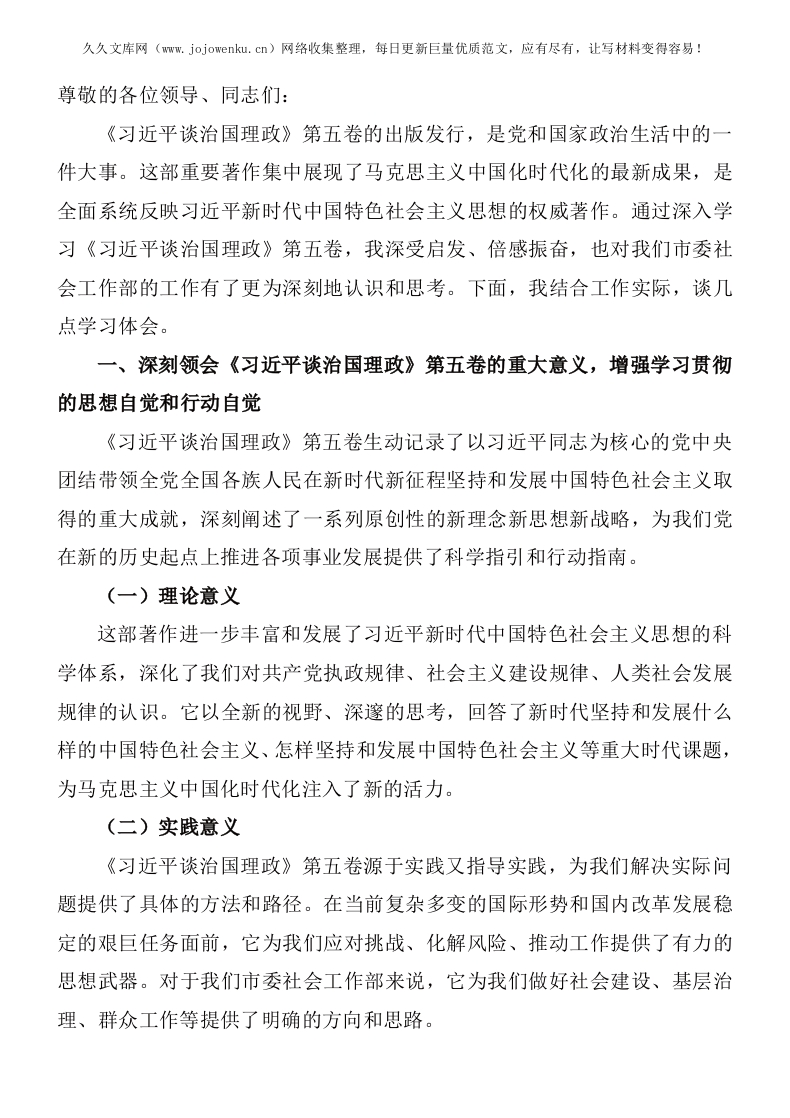 在市委社会工作部理论学习中心组深入学习贯彻《习近平谈治国理政》第五卷精神研讨会上的发言