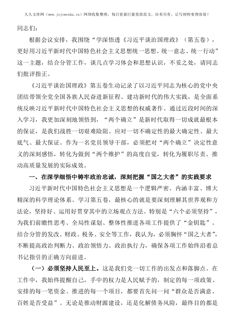 在县委理论学习中心组《习近平谈治国理政》(第五卷)专题学习会上的研讨发言